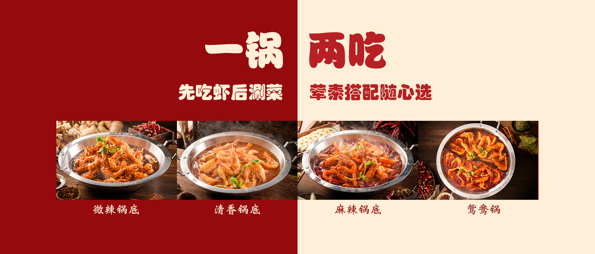 食材精選進(jìn)口大蝦,搭配秘制底料制作而成,研發(fā)出一鍋兩吃的飲食模式(先吃蝦后涮菜,葷素搭配隨心選),打造出綠色健康的飲食新文化。